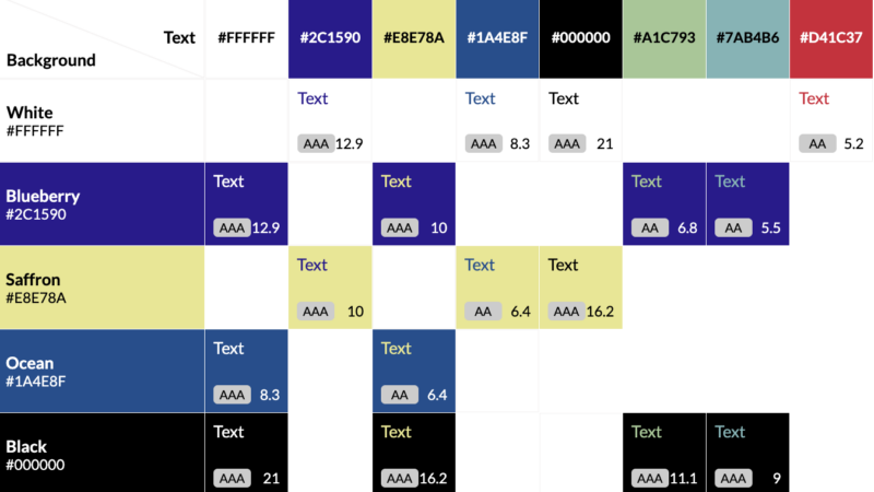 The Contrast Grid, created by Directed Edges (formerly Eight Shapes) is a handy way to check which of your brand colors, when combined, have enough minimum contrast to be legible for accessibility purposes.